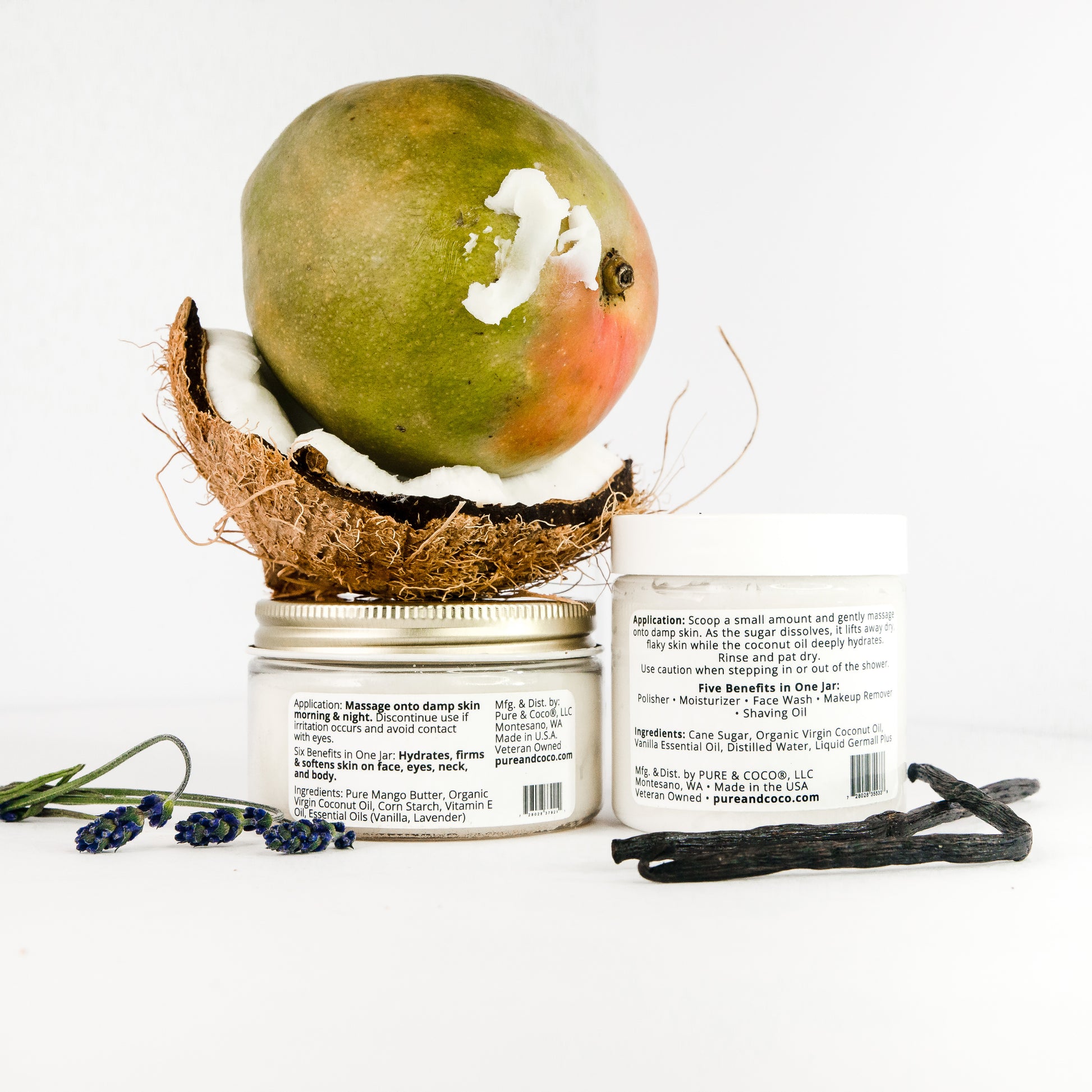 On damp skin, massage a quarter-size amount per area in light circles until the sugar melts; rinse and pat dry. For face cleansing and makeup removal, use a pea-size amount on damp skin, safe on closed eyes to dissolve makeup, including waterproof mascara. For shaving, smooth a thin layer, shave as usual, then rinse.