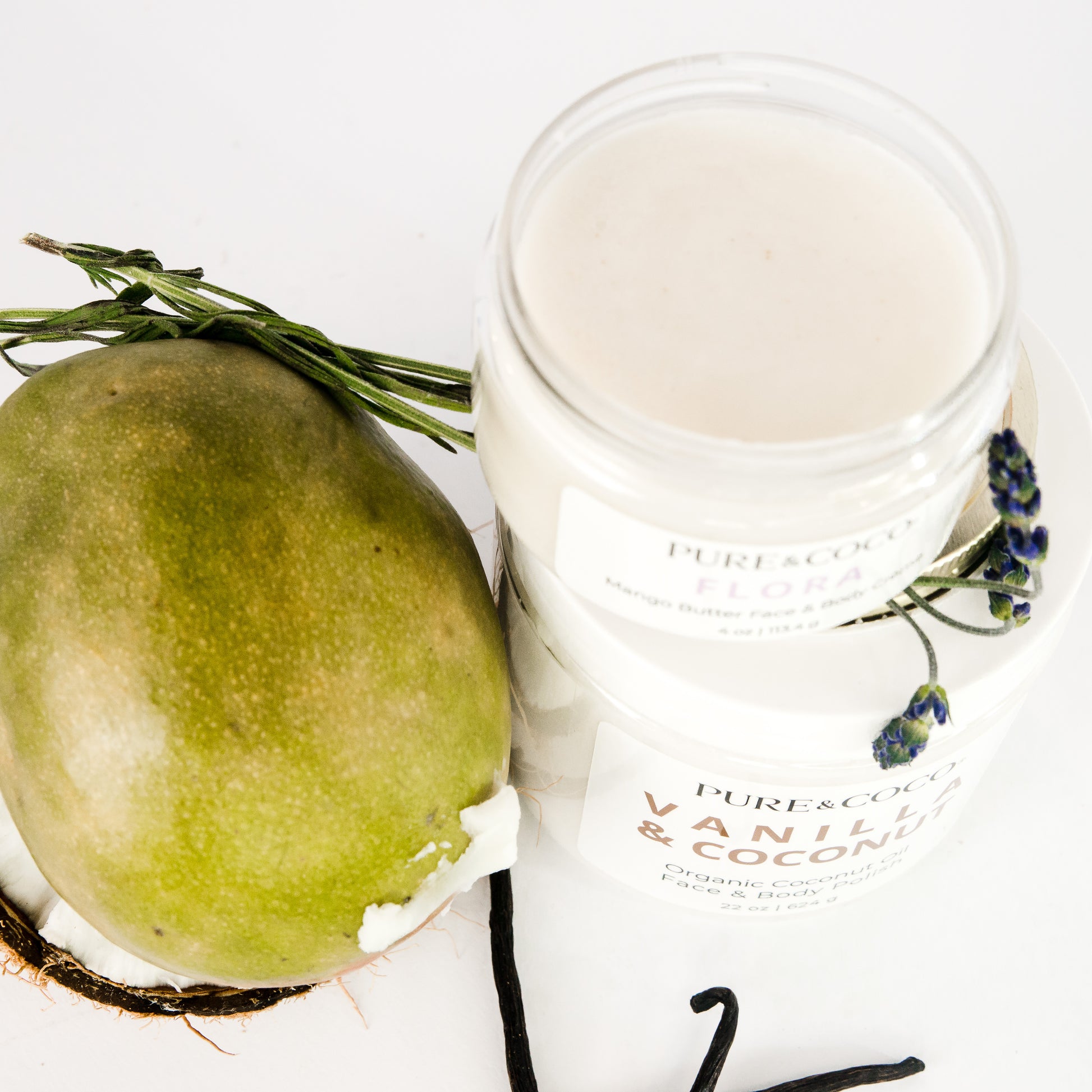 Mango Butter, Organic Cold-Pressed Virgin Coconut Oil, Corn Starch, Vitamin E Oil, Vanilla* Essential Oil, and Lavender Essential Oil.